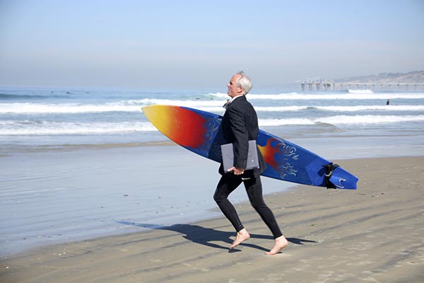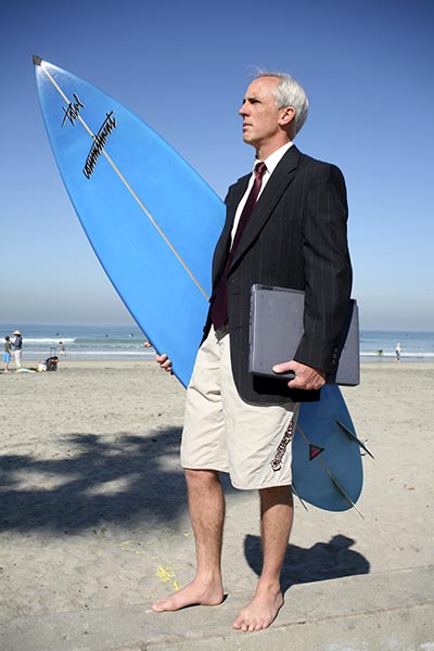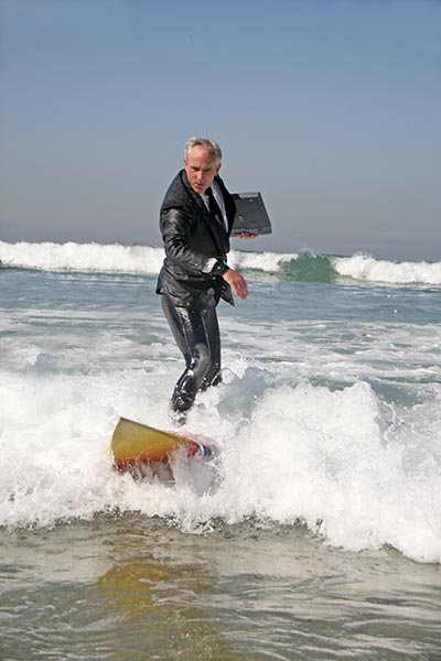 As a photographer, I wanted to capture the essence of today’s surfer and environmentalist. I also wanted to explore a new way of conceptualizing what it means to be “green” – for an individual, for a business, and for the planet. I grabbed my surf buddy Kevin (a professional surf instructor/actor/model), and we brainstormed for all of two minutes then we were off. He had an expired laptop that he was keeping to someday artfully “smash into a gazillion pieces”, but we decided that it would serve a greater purpose as a prop for our shoot (battery removed of course). We grabbed the laptop along with an old suit and some boards, and headed out into the surf, shooting all the way from the car right into the waves. It was pure, inspired, fun. The ideas just rolled out one after the next….Board Director, Green Executive, Rush Hour, Alternative Commute, 5:00, Boss’s Day Off, Surfing the Web, Work Flow, Wet Suit, etc. etc.