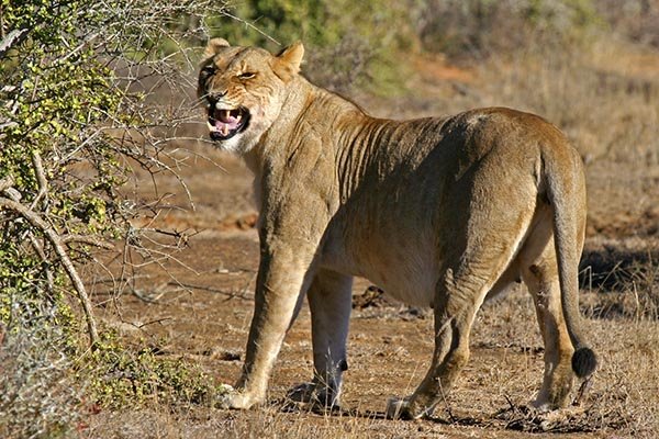 She was followed by the second very pregnant female, seen here picking up the male lion’s scent-marking left on a bush.