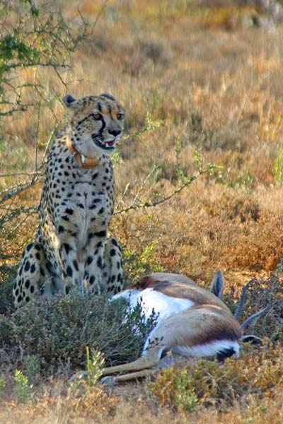 After being elusive for 3 days, mother cheetah finally appeared one morning, exhausted after taking down a springbok. She rested in the shade of a bush with her fresh kill, and called to her cubs, which emerged from the hills timidly and cautiously.
