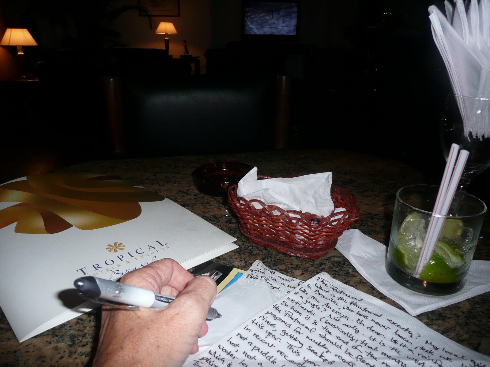 Point being, the Tropical Hotel is simply the place to stay in Manaus. The heavy metal rock band Metallica just checked out, and now Prince Charles and Camilla were there; the staff were already buzzing about news of hosting Obama in the next month (has that happened yet?). Meanwhile, I was finally adjusting to working without my overheated mac, and here at last, I present the final publication of the Amazon napkin blogs. As hand-written.