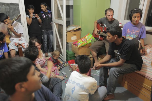 Then dinner. Apparently the Ama Ghar Orphanage where we were invited to dinner was amongst higher status – water buffalo was served and shared with everyone from a high ranking Nepali police official to the 8 or 9 kids we brought from the Loving Arms Orphanage to the guests from America whose knees crackled as they sat awkwardly and struggled with scooping food in their right hands.